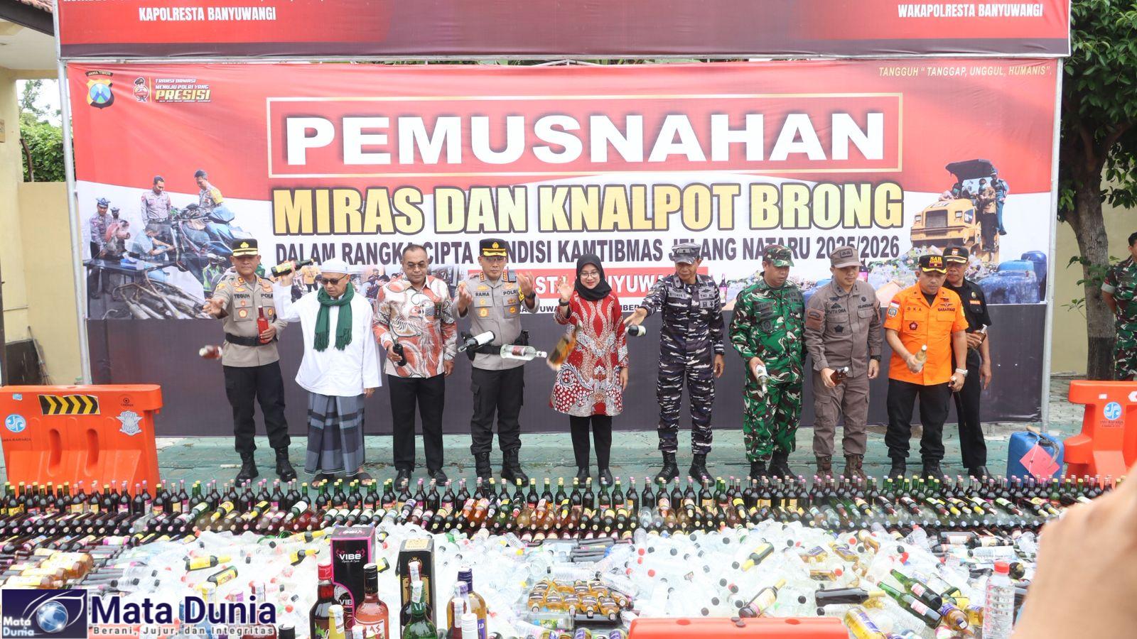 Banyuwangi – Dalam rangka menciptakan situasi keamanan dan ketertiban masyarakat (kamtibmas) yang kondusif menjelang Natal 2025 dan Tahun Baru 2026 (Nataru), Polresta Banyuwangi Polda Jawa Timur melaksanakan pemusnahan ribuan botol minuman keras (miras) serta puluhan knalpot brong hasil penegakan hukum, Jumat (19/12/2025).