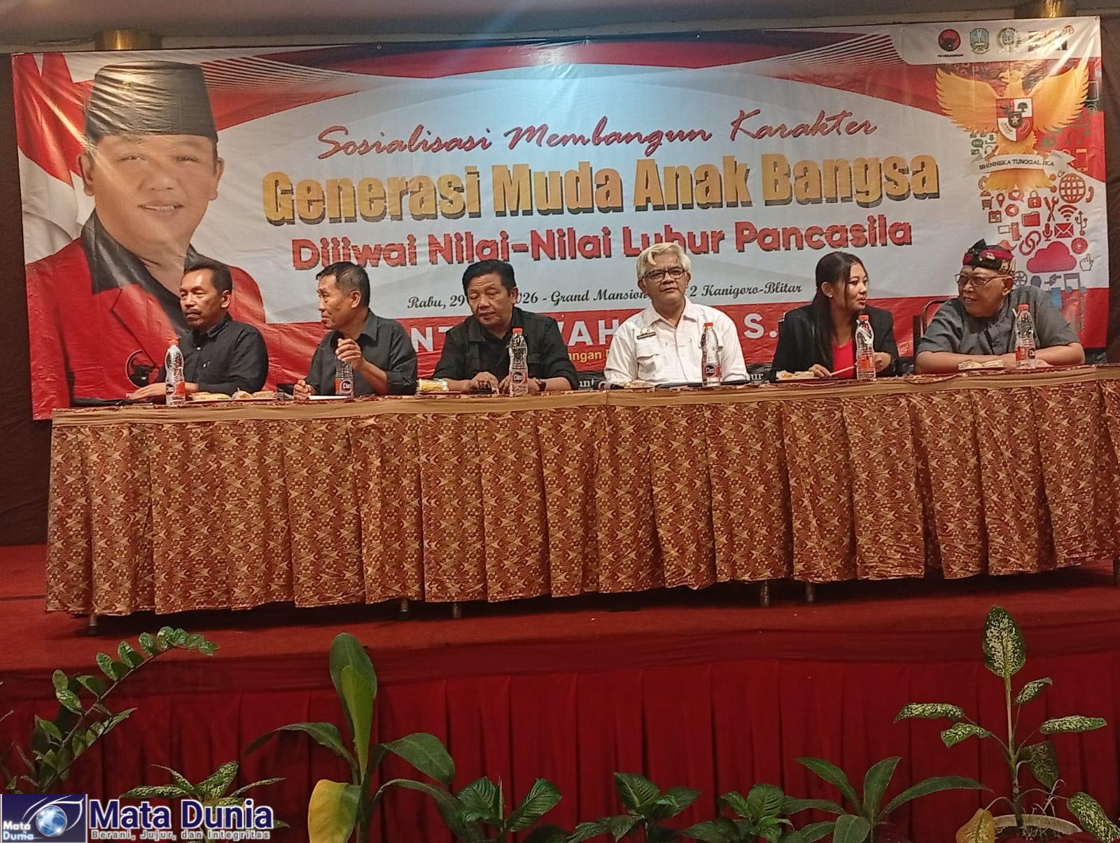 BLITAR | Upaya menanamkan nilai-nilai kebangsaan kepada generasi muda terus diperkuat melalui kegiatan sosialisasi yang melibatkan berbagai elemen, termasuk insan pers. Kegiatan bertema “Membangun Karakter Generasi Muda Anak Bangsa Dijiwai Nilai-Nilai Luhur Pancasila” ini digelar di Hall Hotel Grand Mansion II, Kanigoro, Rabu (29/04/2026), dengan menghadirkan sejumlah narasumber dari unsur legislatif dan pemerintah daerah.